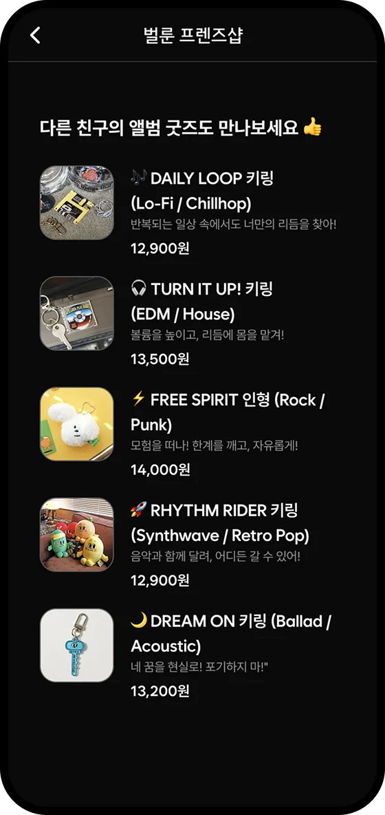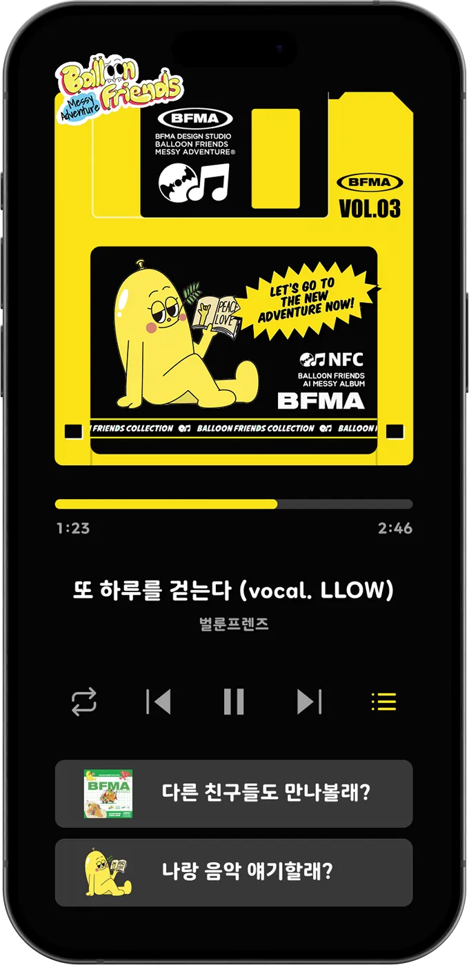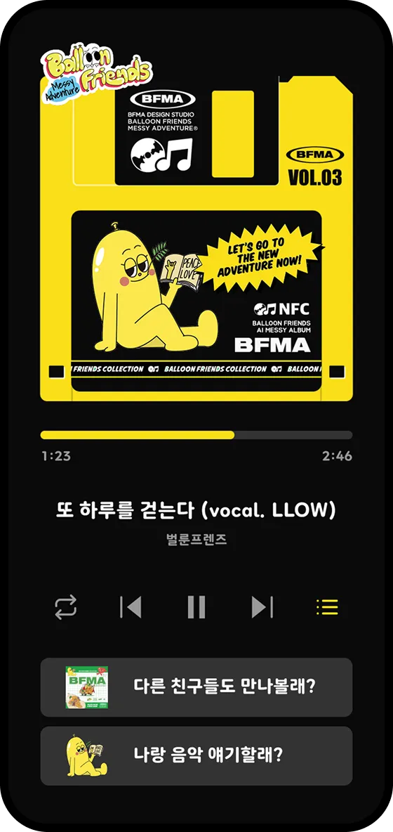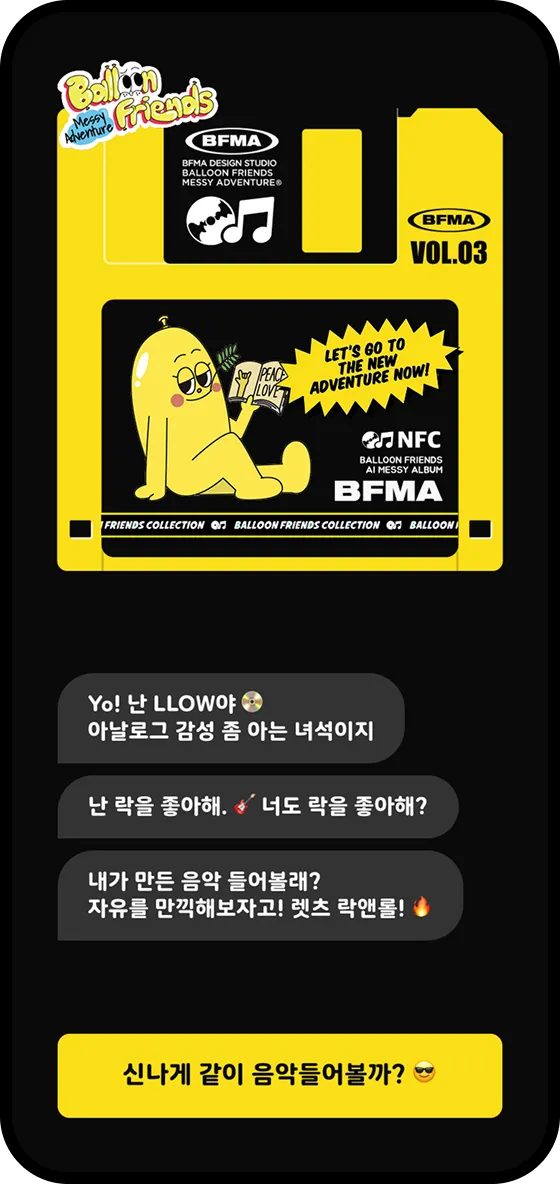 비글즈와 인기 IP 벌룬프렌즈가 만나 AI 인터랙티브 음악 키링 굿즈를 탄생시켰습니다. 스마트폰에 키링을 태그하면, 귀여운 벌룬프렌즈 캐릭터가 등장하고, AI가 자동 생성한 락 비트의 음악을 재생할 수 있습니다. 일상의 흐름 속에서 에너지를 채워주는 사운드 경험을 통해 트랜디함과 강렬함이 공존하는 새로운 감성형 굿즈 콘텐츠를 지금 만나보세요. 비글즈는 다양한 IP 브랜드와의 창의적인 콜라보레이션을 언제든지 환영합니다.