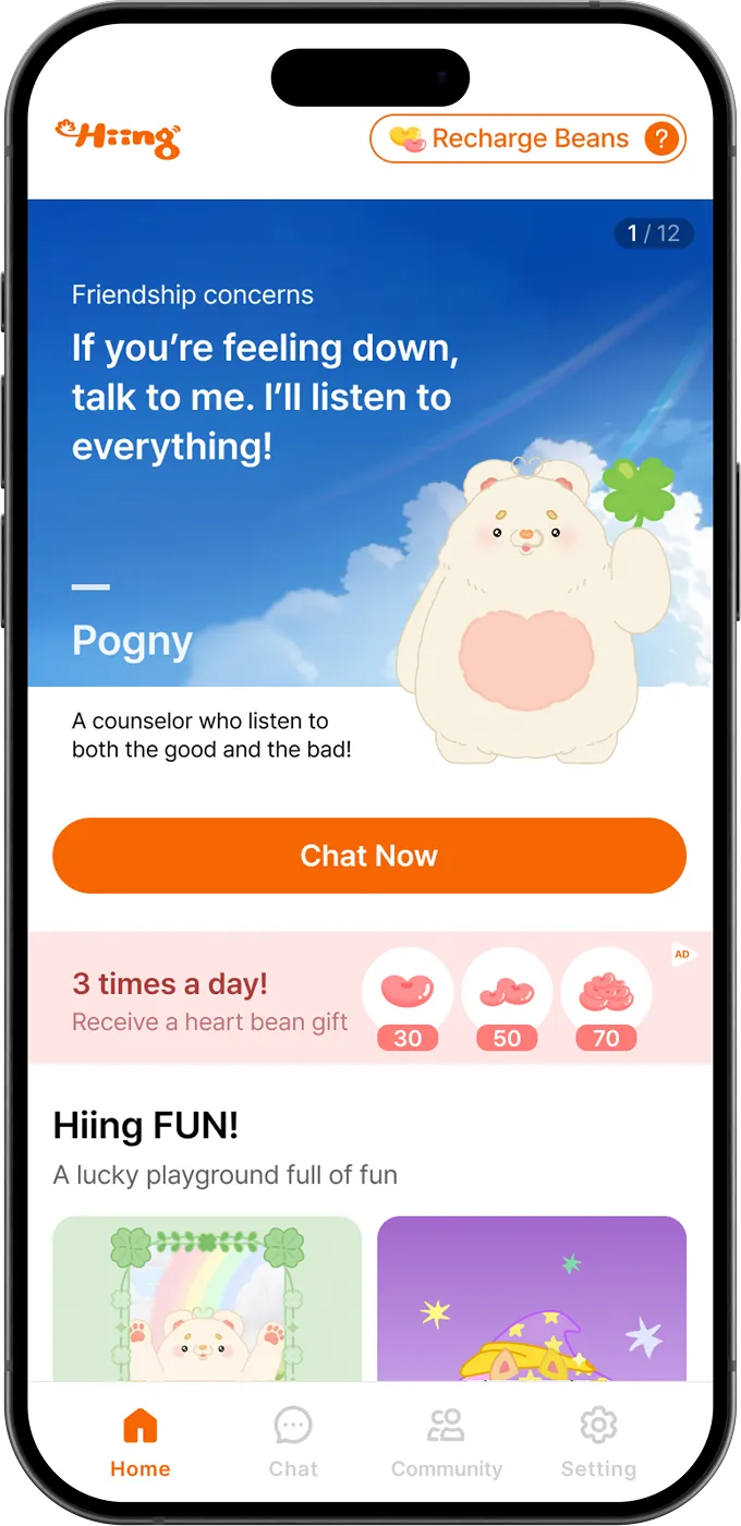 Hiing helps users find emotional balance through daily conversations with AI characters and moments of gentle support. With personalized illustrations and self-affirmation content, it enhances mental wellness in a warm, creative way.