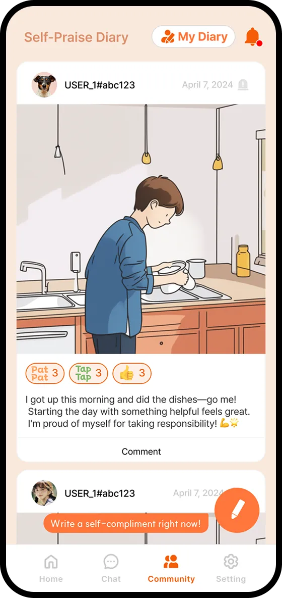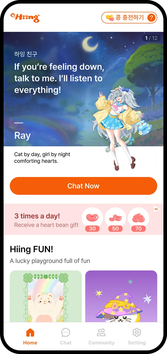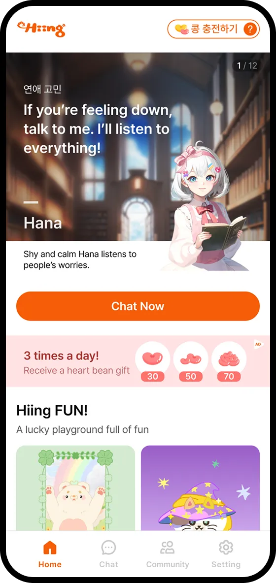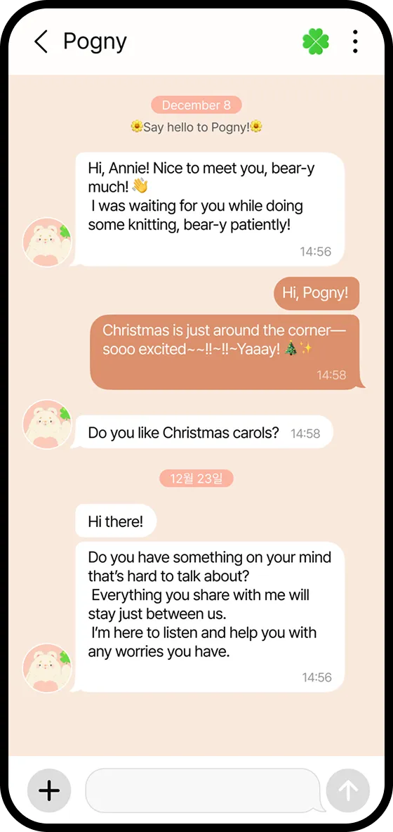 하잉은 하루의 시작과 끝을 AI 캐릭터와 함께하며, 작은 위로와 다정한 지지를 통해 사용자가 감정의 균형을 찾아갈 수 있도록 돕습니다. 비글즈의 캐릭터들과 나누는 자연스러운 대화를 통해, 사용자는 자신의 감정을 이해하고 다독이며, 스스로를 응원하는 긍정의 순간을 일상 속에 차곡차곡 쌓아갈 수 있습니다. AI 이미지 생성 기술을 활용한 ‘셀프 칭찬 일기’ 콘텐츠는 사용자 맞춤형 캐릭터 일러스트와 함께 멘탈 웰니스 경험을 더욱 풍부하게 만들어줍니다.