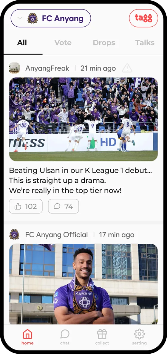 TAGGIN은 덕질, 커머스, 소통이 한곳에 모인 Z세대를 위한 스마트 팬덤 아지트입니다. 개인의 취향에 꼭 맞는 콘텐츠를 추천받아 나만의 팬덤 경험을 완성할 수 있고, 굿즈 구매부터 팬 경험치(XP) 적립까지 모든 활동을 데이터로 축적할 수 있습니다. NFC 굿즈 연동을 통해 실물 굿즈의 수집, 인증, 팬심 기록까지 가능합니다. TAGGIN은 팬을 팬덤 경제 생태계의 주체로 성장시키며, 좋아하는 것을 향한 열정이 진짜 영향력과 기회로 연결되는 미래를 만듭니다.